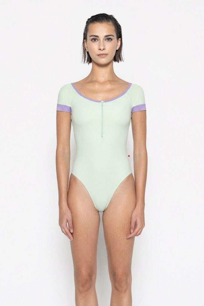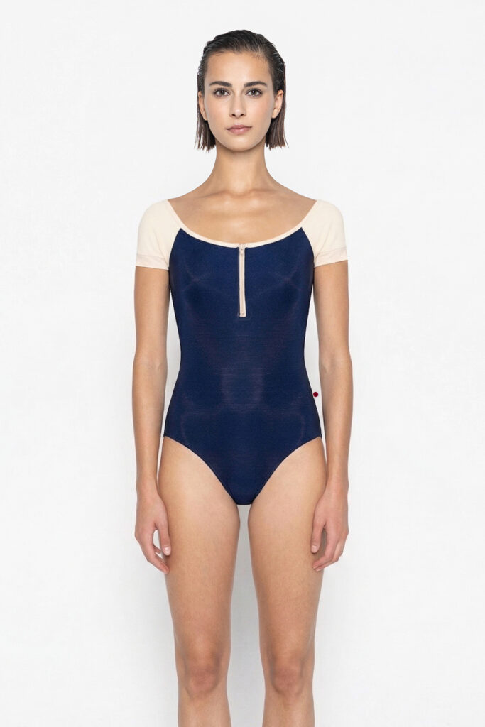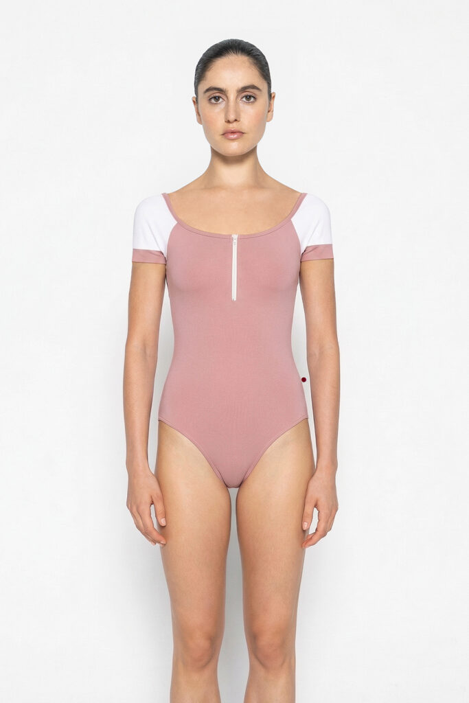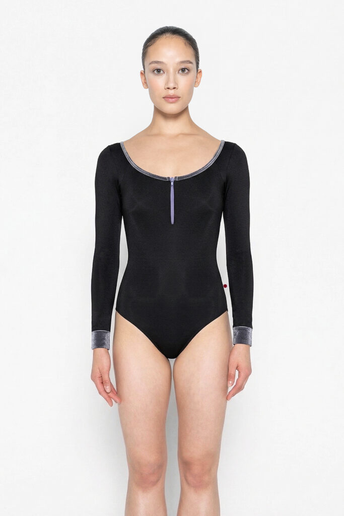 The CHLOE MESH offers a scoop neckline, front zipper, raglan sleeves, and a low mesh back. When ordering with sleeves, we recommend sizing up for added comfort.